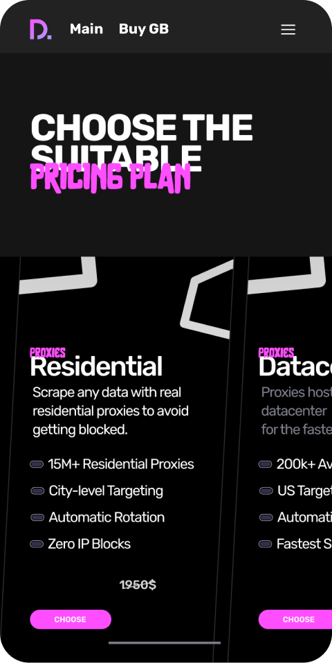We don't store your data and since you use our proxies noone can get an actual data about you. Your device or location. Proxies can be used to anonymize the IP of a scraper, to extract data from websites without being blocked or rate-limited.
